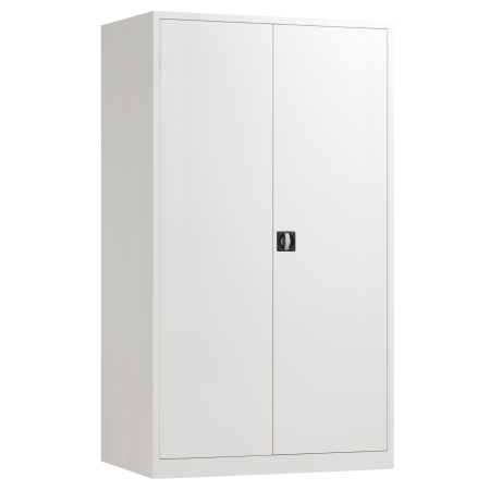De kast is uitgerust met twee stevige draaideuren en voorzien van een geïntegreerd cilinderslot, zodat de inhoud veilig opgeborgen blijft. Het robuuste stalen corpus is volledig gelast en afgewerkt met een krasvaste poedercoating, wat zorgt voor langdurige stabiliteit en een professionele uitstraling.