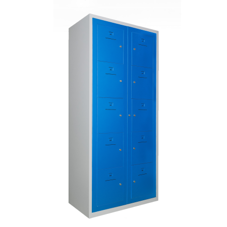 De JGR 195-2.10 beschikt over tien afzonderlijk afsluitbare vakken, verdeeld over twee kolommen. Elk vak is voorzien van ventilatiesleuven voor optimale luchtcirculatie en een labelhouder voor duidelijke identificatie per medewerker. Dit zorgt voor orde, hygiëne en goed overzicht.