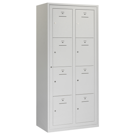 De JGR 195-2.8 beschikt over acht individueel afsluitbare vakken, verdeeld over twee kolommen. Elk compartiment is uitgerust met ventilatiesleuven voor luchtcirculatie en een labelhouder voor duidelijke identificatie per medewerker. Zo blijft de kleding geordend en goed herkenbaar.