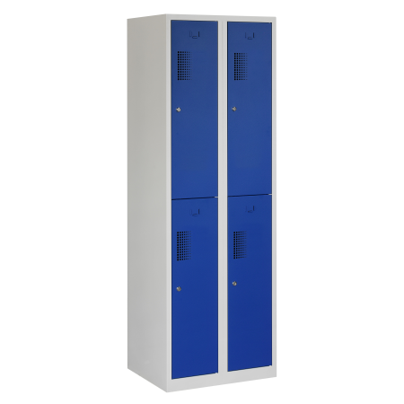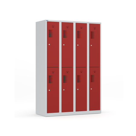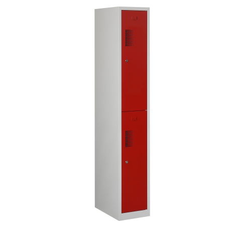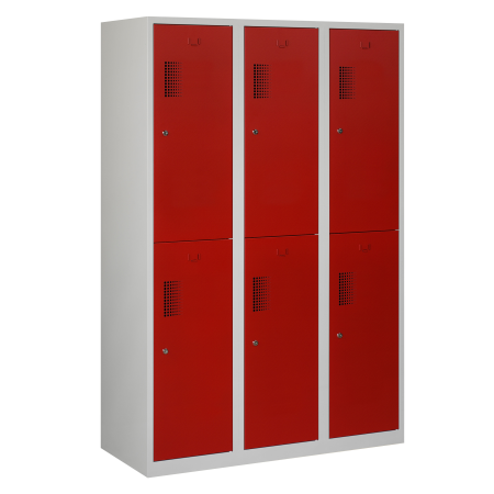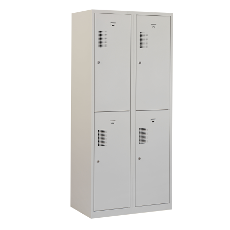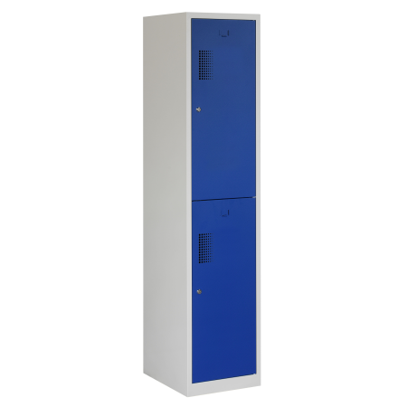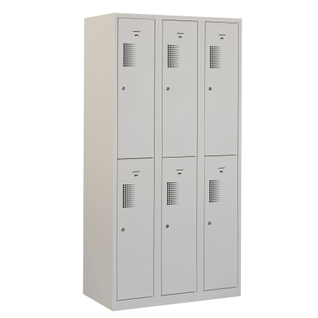 De CH NH 180-3.6 garderobekast beschikt over twee afzonderlijk afsluitbare vakken in één slanke behuizing. Dankzij de geperforeerde deuren blijft de inhoud optimaal geventileerd, wat zorgt voor een frisse en droge opbergruimte. Ideaal voor gebruik in kleedruimtes, scholen, sportfaciliteiten en bedrijven.