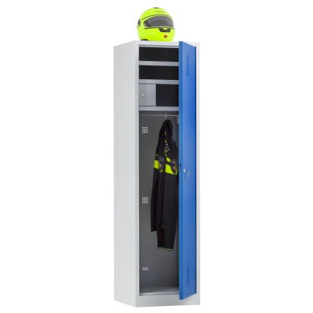 De kast is vervaardigd uit 0,9 mm dik staal, wat zorgt voor een sterke en duurzame behuizing. De professionele kleurencombinatie RAL 7035 (lichtgrijs) en RAL 5007 (blauw) geeft de garderobekast een herkenbare en representatieve uitstraling, passend binnen veiligheids- en overheidsinstellingen.