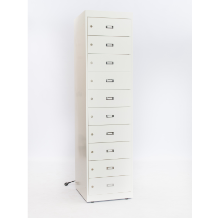 De kast op de foto toont een hoog, slank model met tien afsluitbare compartimenten, ideaal voor scholen, kantoren en organisaties waar meerdere apparaten centraal beheerd moeten worden.
